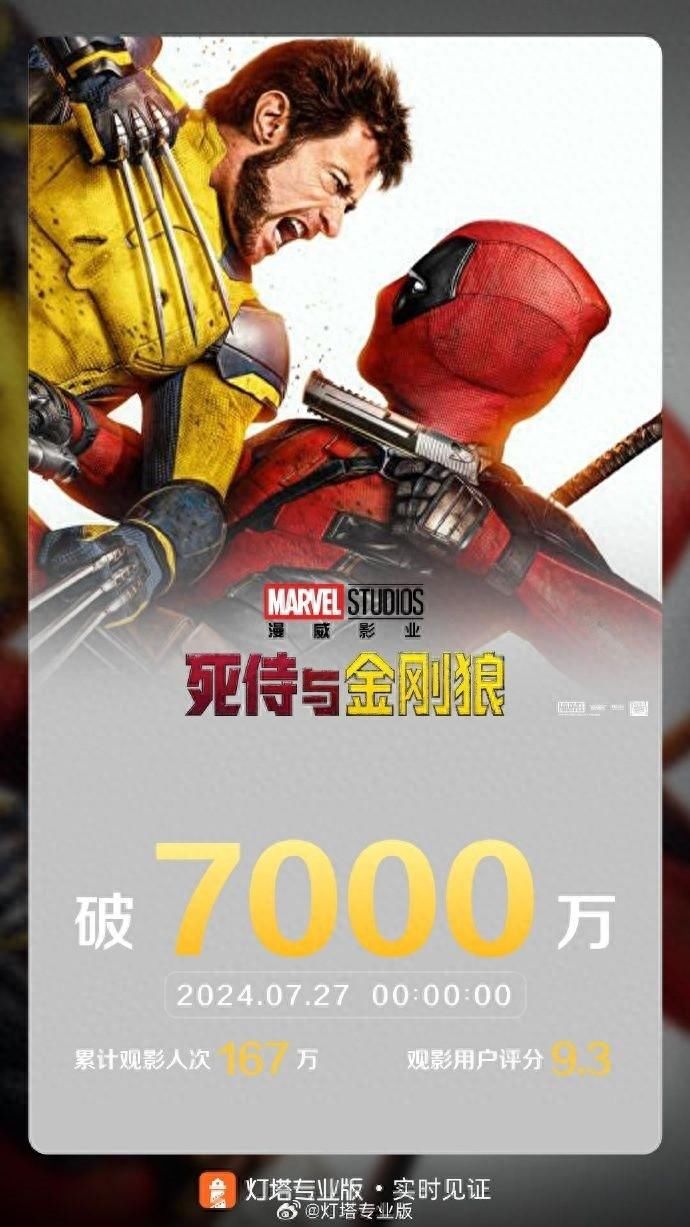 据灯塔专科版及时数据涌现开云体育,戒指7月27日0时0分,影片《死侍与金刚狼》票房如故打破7000万。