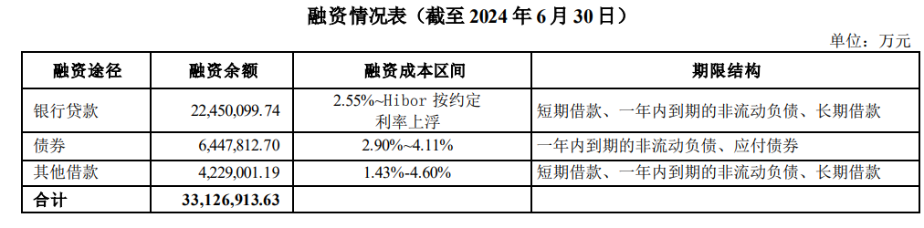 到2024年6月末,万科有息欠债打算3312.7亿元,一年内到期的有息欠债1019.5亿元,占比为30.8%;一年以上有息欠债2293.2亿元,占比为69.2%。分融资对象来看,银行借款占比为67.8%,为2245亿,叮咛债券占比为19.5%,约为644.78亿,其他借款占比为12.7%,约为422.9亿。