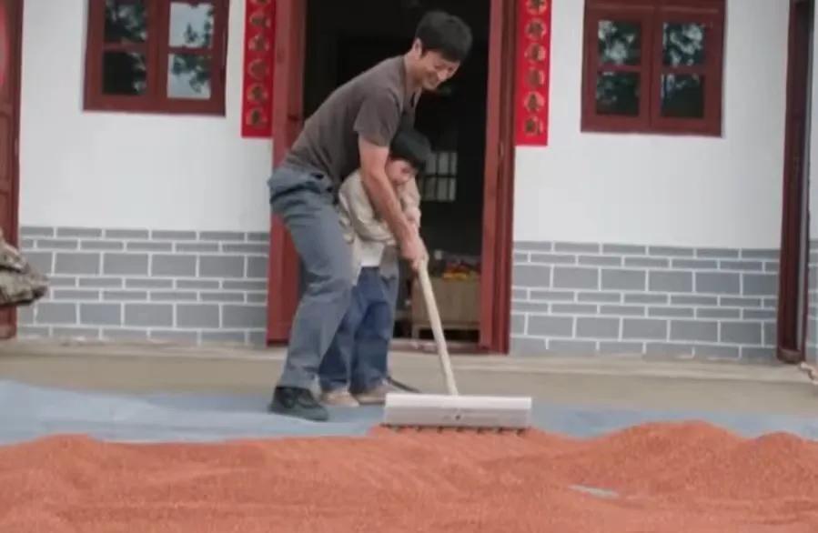 还有一些具体细节呈现上,林江国既有着传统老农民的呈现,包括在地内部侍弄高粱等庄家,还有丰充后,将打好的谷粒摊晒在院子里,带着女儿用耙子等器具进行或耧或翻等操作,关于成长在农村里的一又友们而言,这些场景齐相称的真实亲切恣虐活命气味。