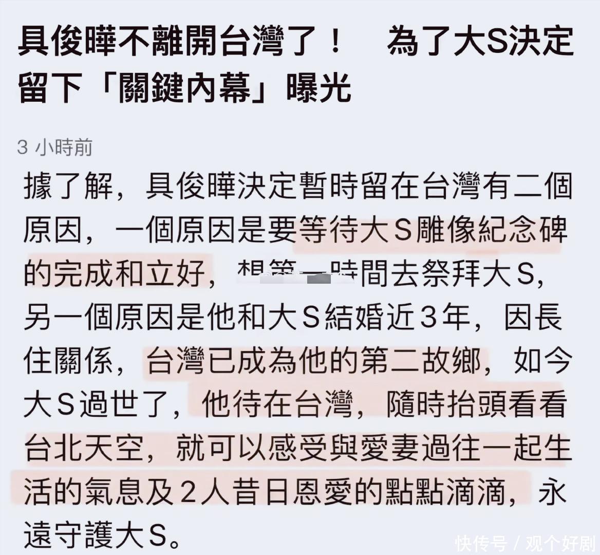 与此同期,大S的丈夫具俊晔也决定留在台湾,遥纵眺护大S。