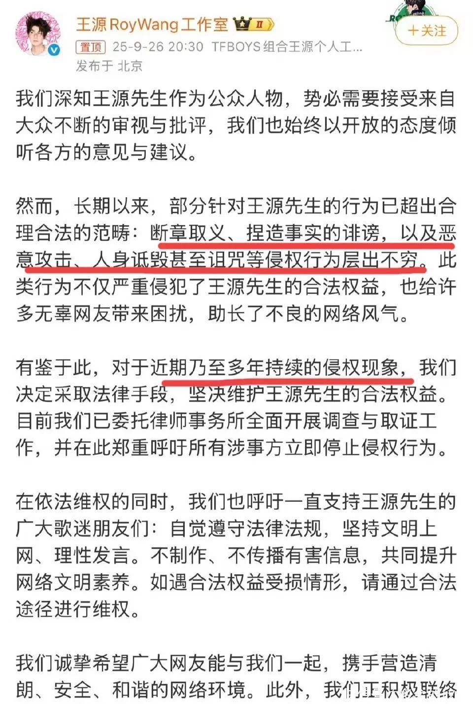 王源职责室于9月26日晚间发布的维权公告,用“近期乃至多年捏续”的表述,浮光掠影地揭开了一个行业伤痕——当明星形象成为流量经济的“硬通货”,权利的博弈早已越过了个体纠纷,演变为一场对于常识产权、粉丝文化致使数字时期伦理的复杂对话。