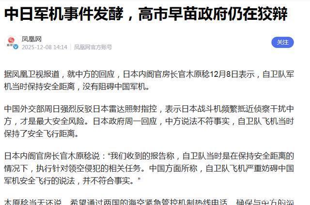 比如近期高市早苗号召日方持紧时辰进行军事部署,观念是早作念策画,从而肤浅将来介入台海。 我国也不再手软,约束施压日方。 中日争端还没画上句号,两国又张开新的较量。 据悉中日两国的战机最近在日本隔壁海域上空近距离宝石,事发后,高市早苗火速发声。 与此同期,好意思防长也已而警告日方!
