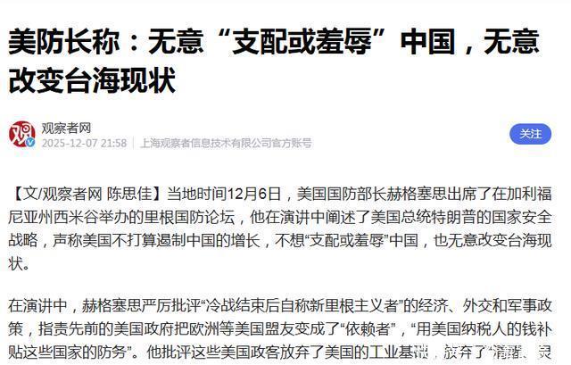 不外日方也深知无力长期对抗中方,于是日方请求好意思方着手。 好意思防长却教唆日方:别总想着依靠好意思方,最佳尽快加多军费,否则终将付出代价! 日方如今靠近着莫得国度赞理的逆境,竟然搬砖砸脚!如果日方还不纠错,之后会比现时更惨。 参考府上: 1.鲁网2025-12-07辽宁舰航母编队宫古海峡以东海域检会,日本自保队飞机屡次抵近侵扰 2.不雅察者网2025-12-07好意思防长称:不测“主管或欺侮”中国,不测转变台海近况 3.央视新闻2025-12-07好意思防长:特朗普政府将“把国度骨子利益放在首位”