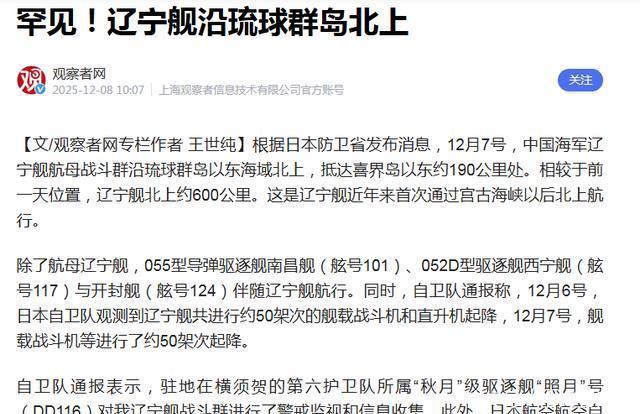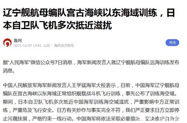 二、高市早苗匆忙发声 有音书称,12月8日高市早苗就此事发声,但她可莫得认错,而是威逼我国。 高市早苗宣称:日方之后会随时监视中方在日本隔壁的举止,以保证日方的安全! 这话就标明,日方不肯纠错,还休想着络续和我国作对。 况且高市早苗真的言行若一,很快就密切监视我国航母的一颦一笑。