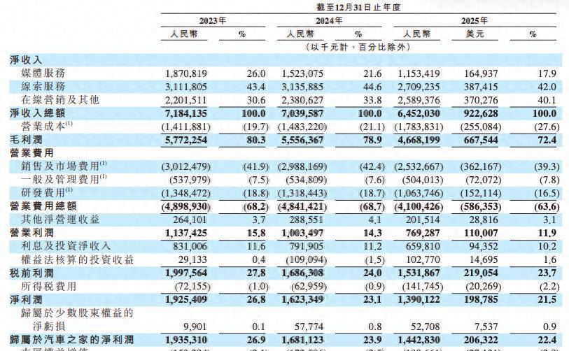 值得耀眼的是,2025年汽车之家已是领略第二年出现营收和净利润双降。同期,公司毛利率也呈现逐年下滑趋势。2023年至2025年,公司毛利润永别为57.72亿元、55.56亿元、46.68亿元,毛利率永别为80.3%、78.9%、72.4%,3年下跌了近8个百分点。