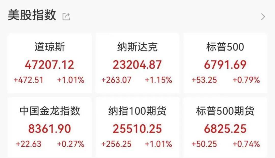 好意思股三大指数皆涨,均创历史收盘新高。罢了收盘,谈指收涨1.01%,报47207.12点;纳指收涨1.15%,报23204.87点;标普500指数收涨0.79%,报6791.69点。本周,好意思股三大指数均录得约2%的涨幅。