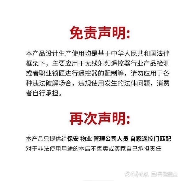 在该商品的销售鸠集,记者细心到,商家有两则声明,离别为“免责声明”和“再次声明”。两个声明写谈,本居品主要期骗于无线射频遥控器行业居品检测能够工作锁匠进行遥控器的配制等,请勿期骗于各式不法破解场地。同期,声明强调,本居品只提供给保安、物业、措置公司东谈主员、自家遥控门匹配。